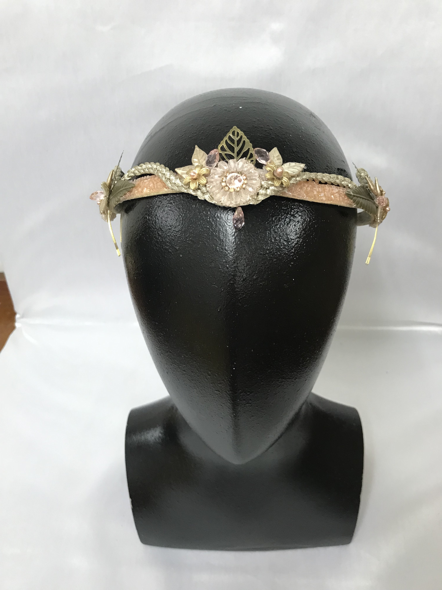 Elegantíssima corona que combina una trenza con metales con pasamanerías, flores y hojas de diferentes materiales.